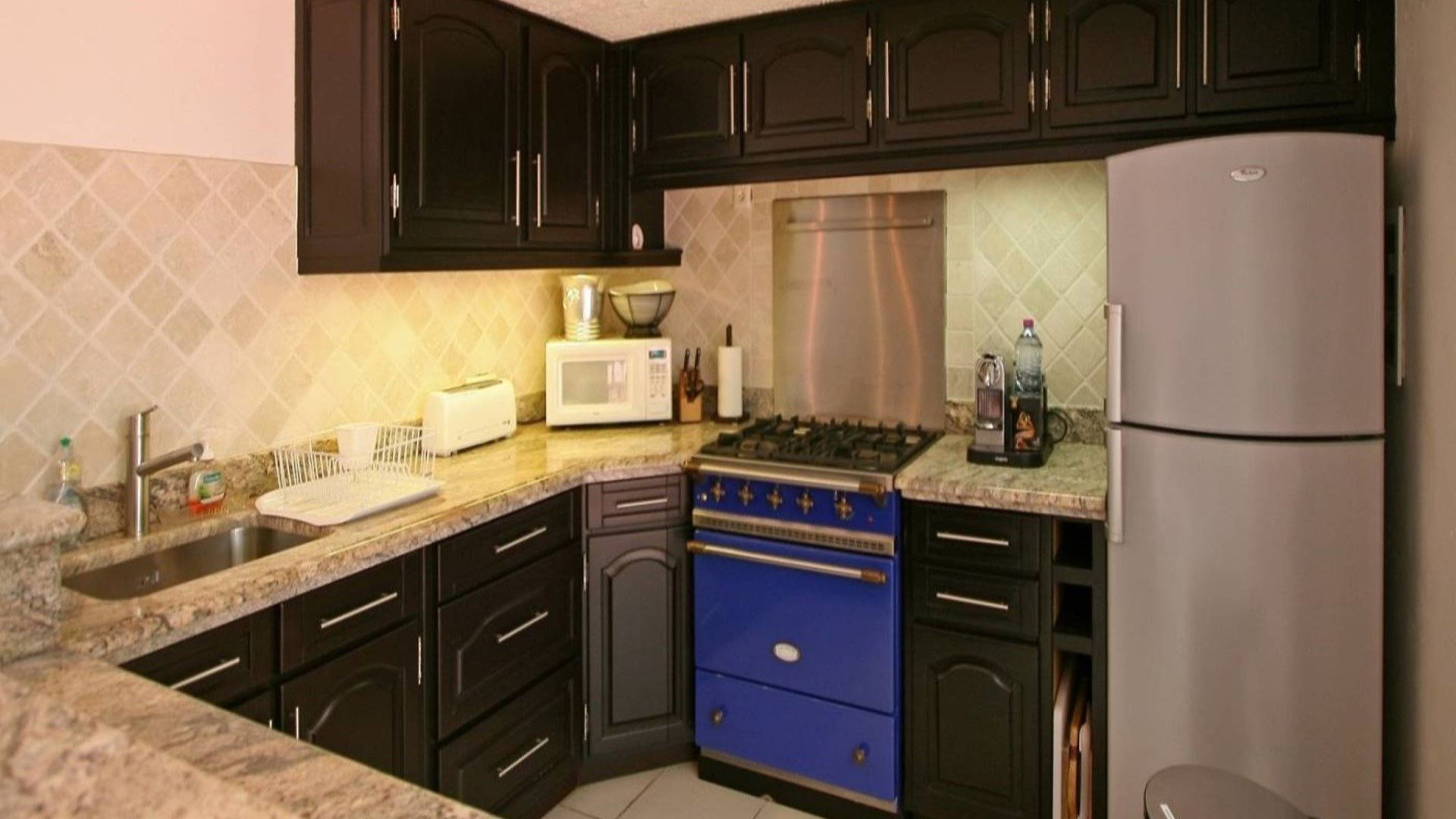 El amplio salón climatizado, con sofás acogedores y una decoración sofisticada, se abre a una terraza con impresionantes vistas al mar, fusionando los espacios interiores y exteriores. La cocina totalmente equipada, con barra de desayuno, permite preparar deliciosas comidas que pueden disfrutarse en el comedor interior o al aire libre, con la brisa tropical y el sonido del océano como telón de fondo.