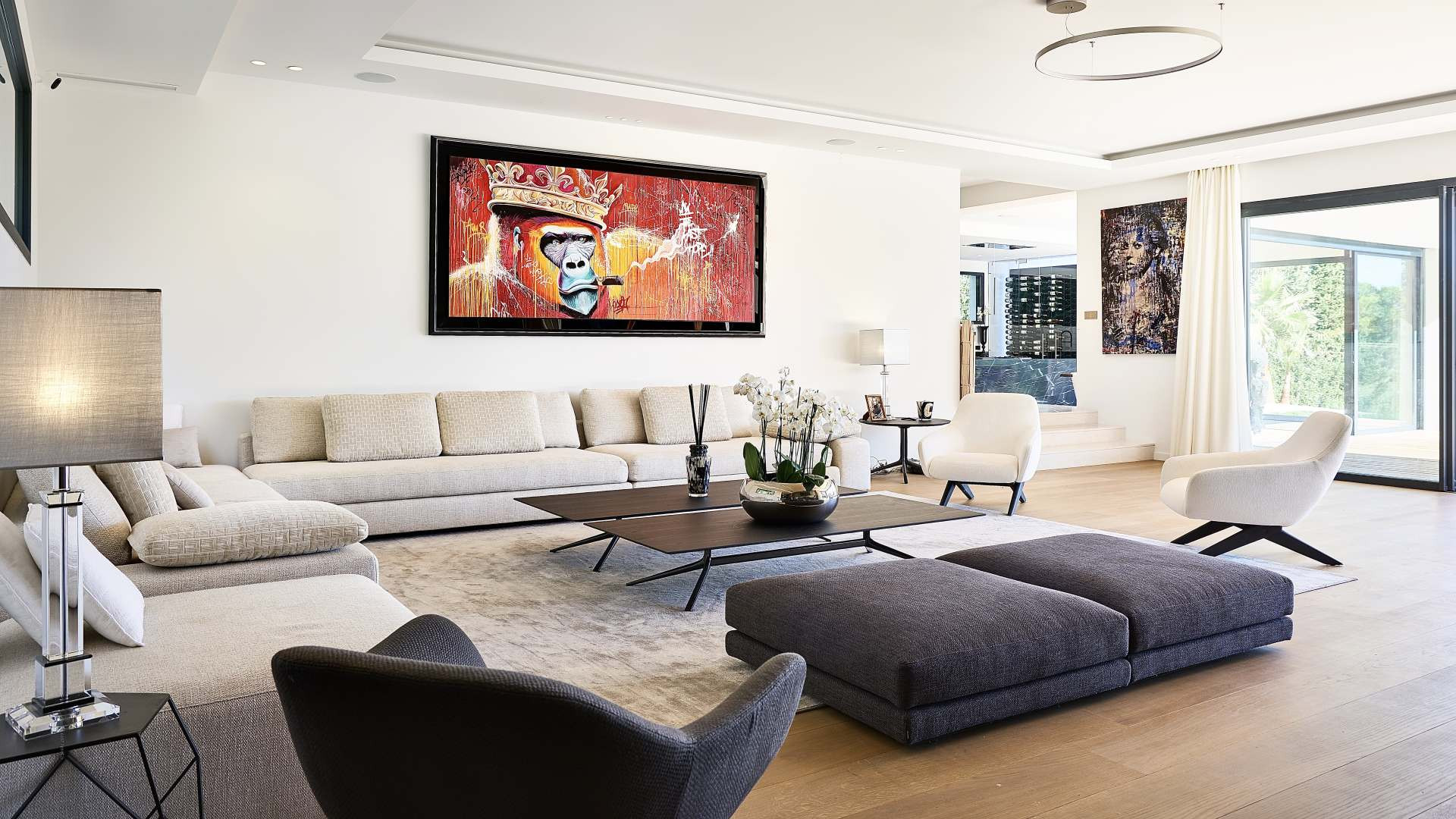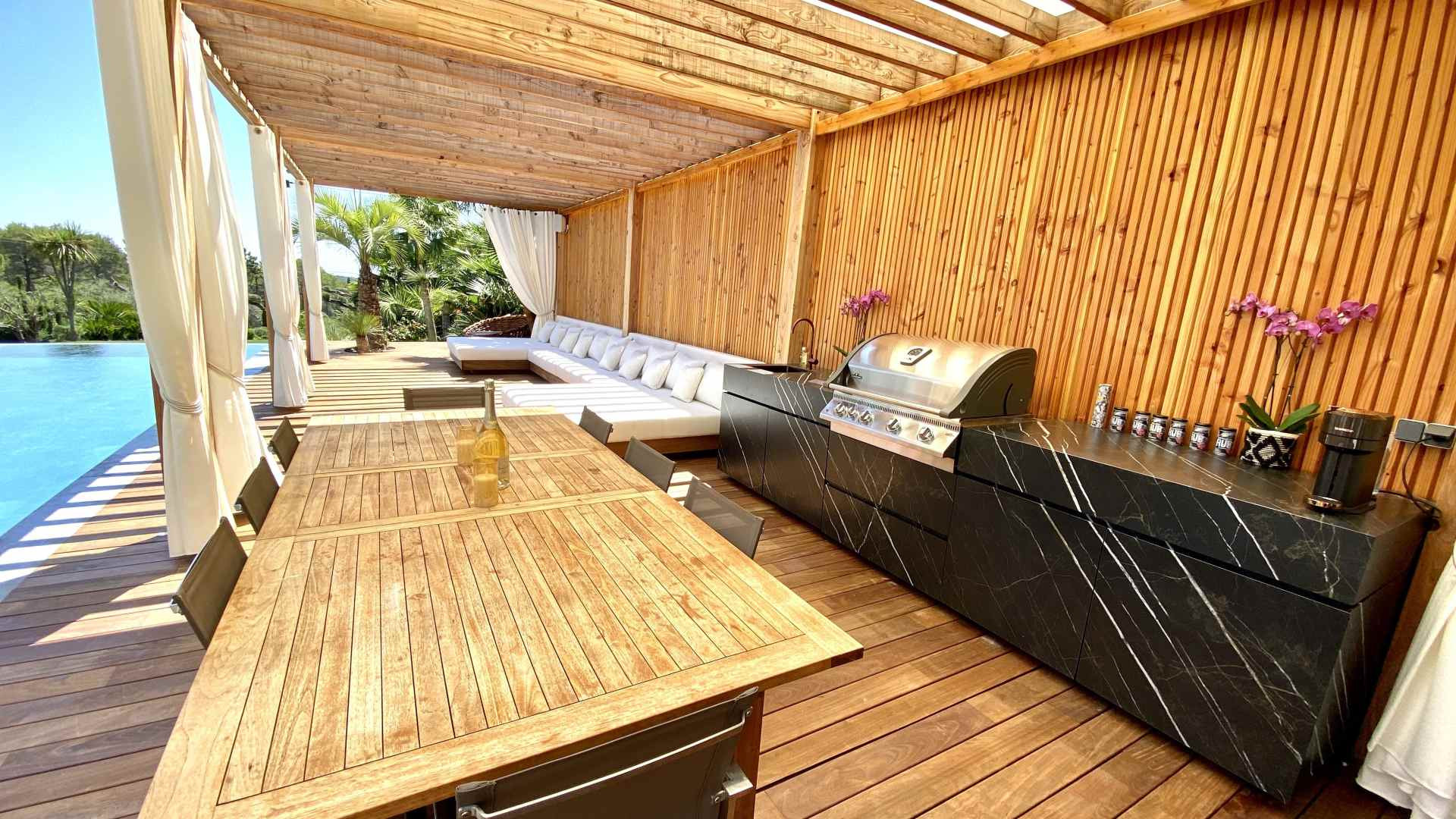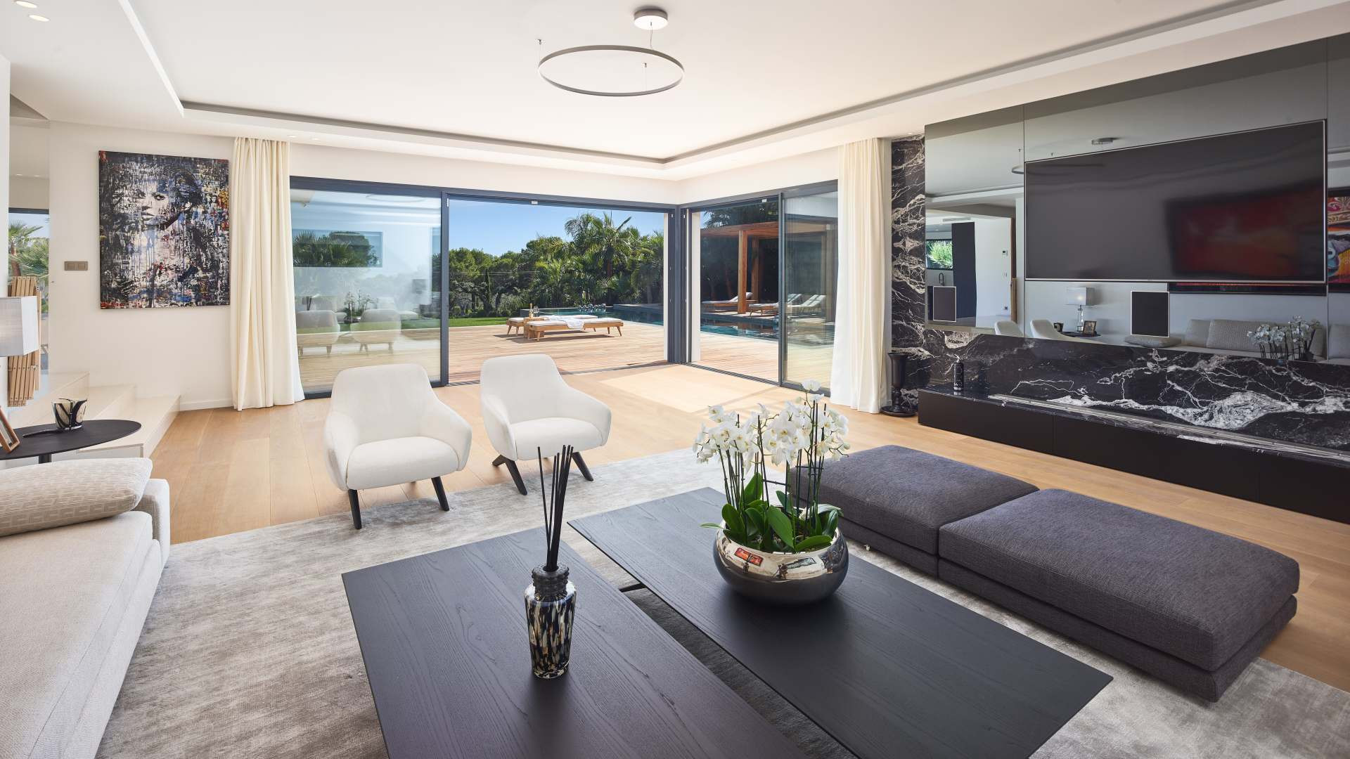 La villa dispose de vastes espaces de réception lumineux avec salon design, salle à manger élégante et cuisine gastronomique équipée haut de gamme avec îlot en onyx et cave à vin vitrée. Les extérieurs offrent une piscine à débordement chauffée, de larges terrasses, un salon outdoor sous pergola, une cuisine d’été et un putting green privé de 5 trous, rare sur le marché des villas de luxe à louer à Cannes et Mougins.
