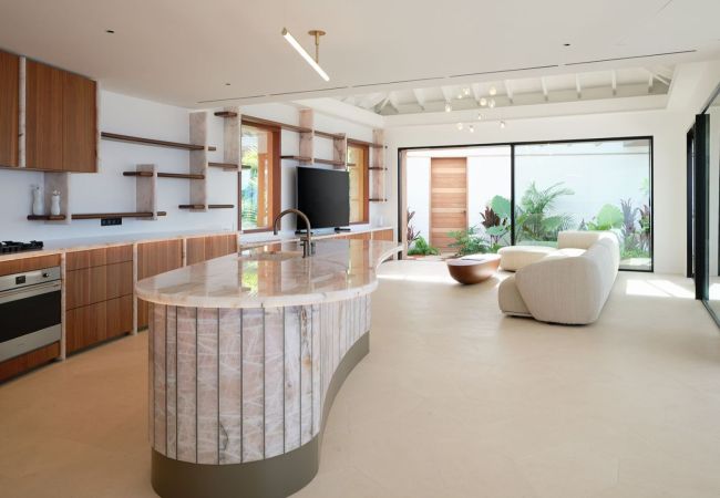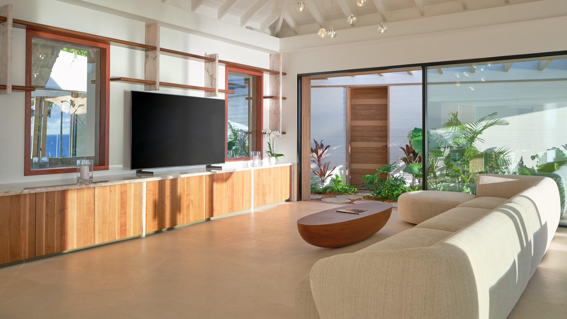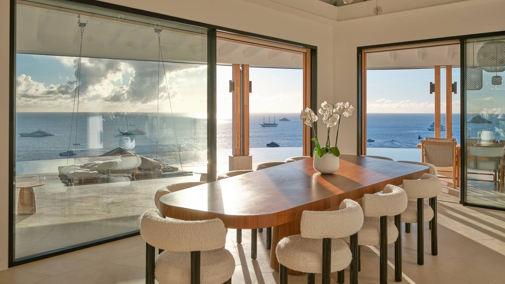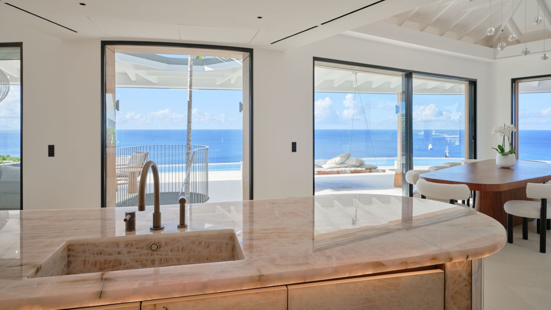 Les espaces de vie ouverts et lumineux créent une transition harmonieuse entre intérieur et extérieur, offrant un cadre idéal pour savourer la beauté paradisiaque de Saint-Barthélemy. Le salon, décoré avec un raffinement subtil, s’ouvre sur une cuisine moderne entièrement équipée, parfaite pour des moments de partage conviviaux. Pour une expérience encore plus exclusive, la villa propose les services d’un chef privé et d’un butler, assurant un séjour sur-mesure où chaque détail est pris en charge.