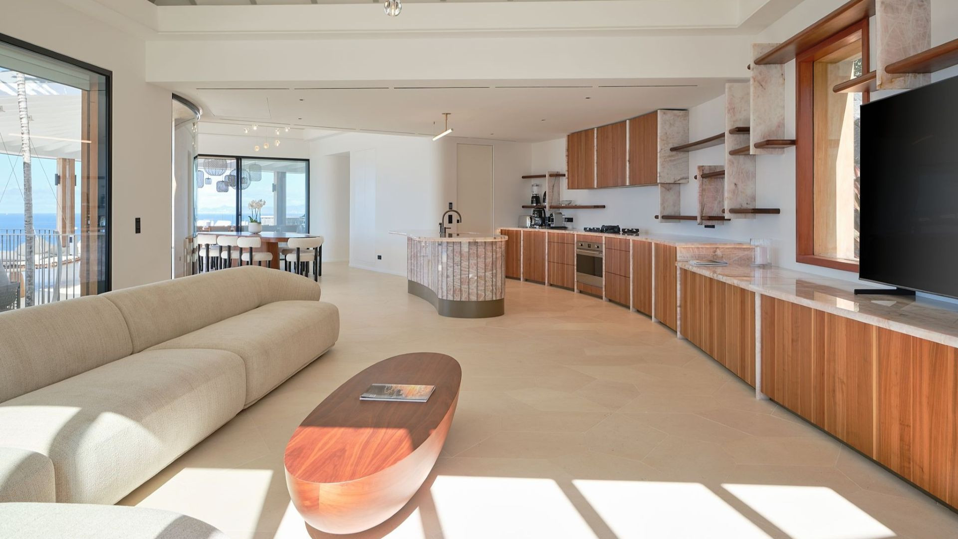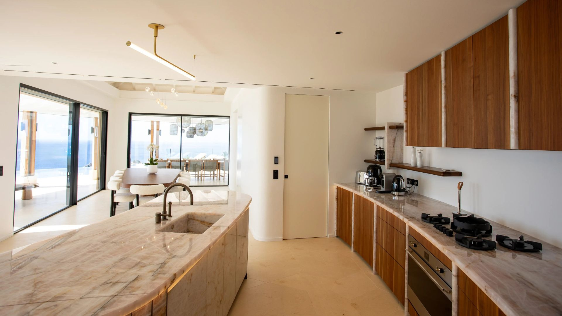 Au niveau principal, l'espace piscine, face à l'océan, invite à la contemplation et à la détente. On peut savourer la vue époustouflante depuis les canapés extérieurs ou se réunir autour de la table à manger. Si le vent se lève, la table à manger intérieure dans la cuisine offre une alternative chaleureuse.