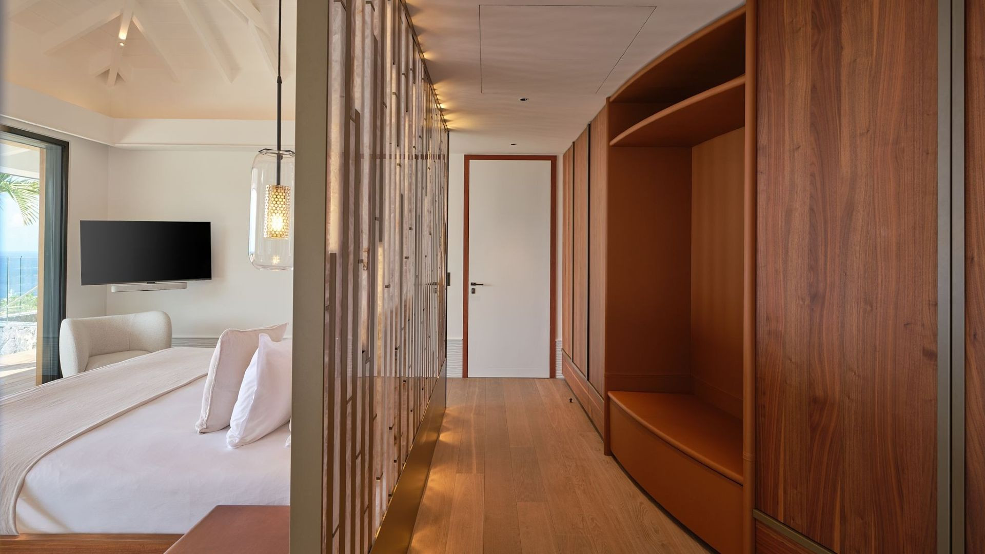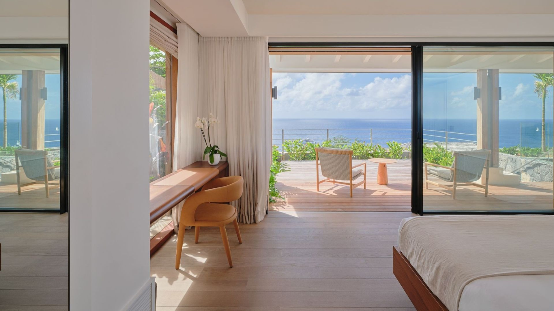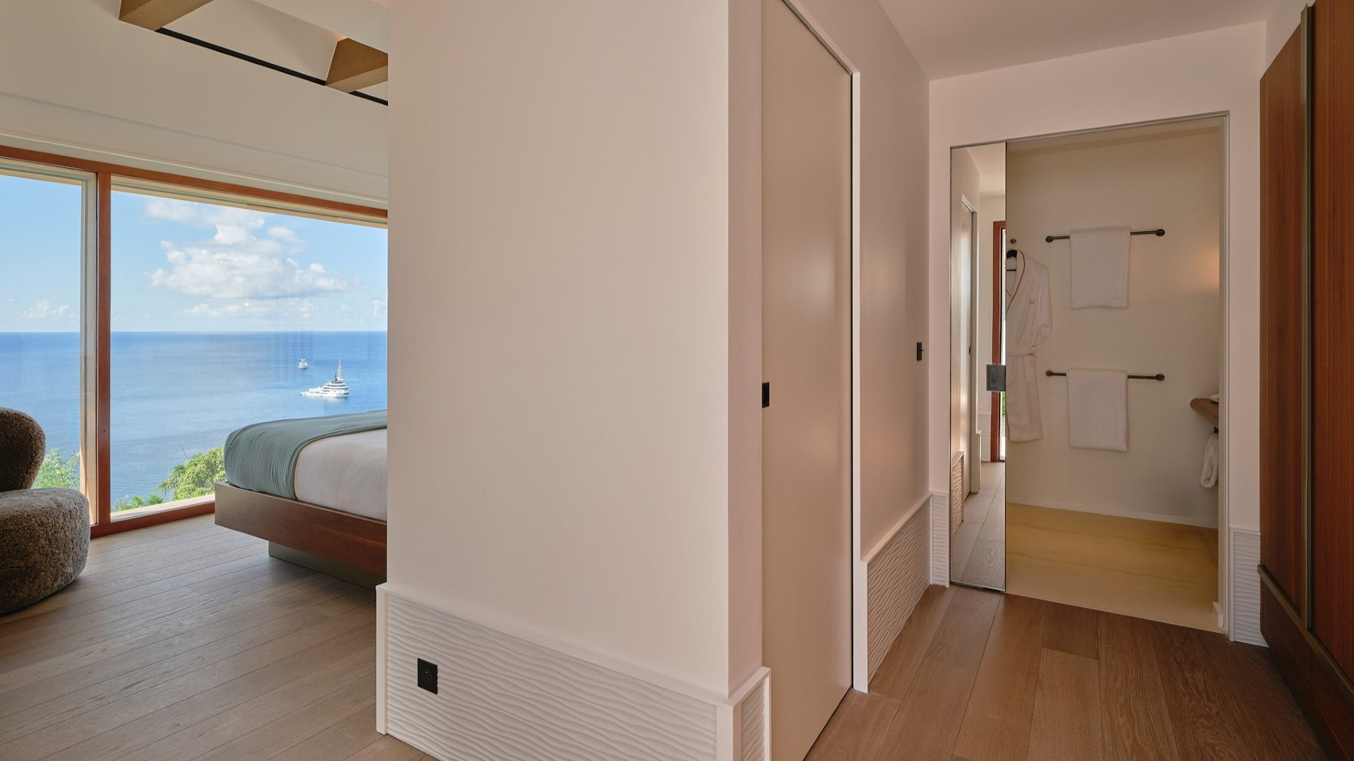 Avec quatre chambres en suite, cette villa St Barth offre un confort absolu et une intimité parfaite. Chaque chambre dispose d’un lit king-size, d’un mobilier en bois massif conçu sur mesure et d’une salle de bain attenante avec douche à paroi de verre, permettant d’admirer la végétation locale soigneusement aménagée. L’atmosphère chaleureuse et sophistiquée des espaces nuit invite à des nuits paisibles, bercées par la douceur des alizés et le murmure de la nature environnante.