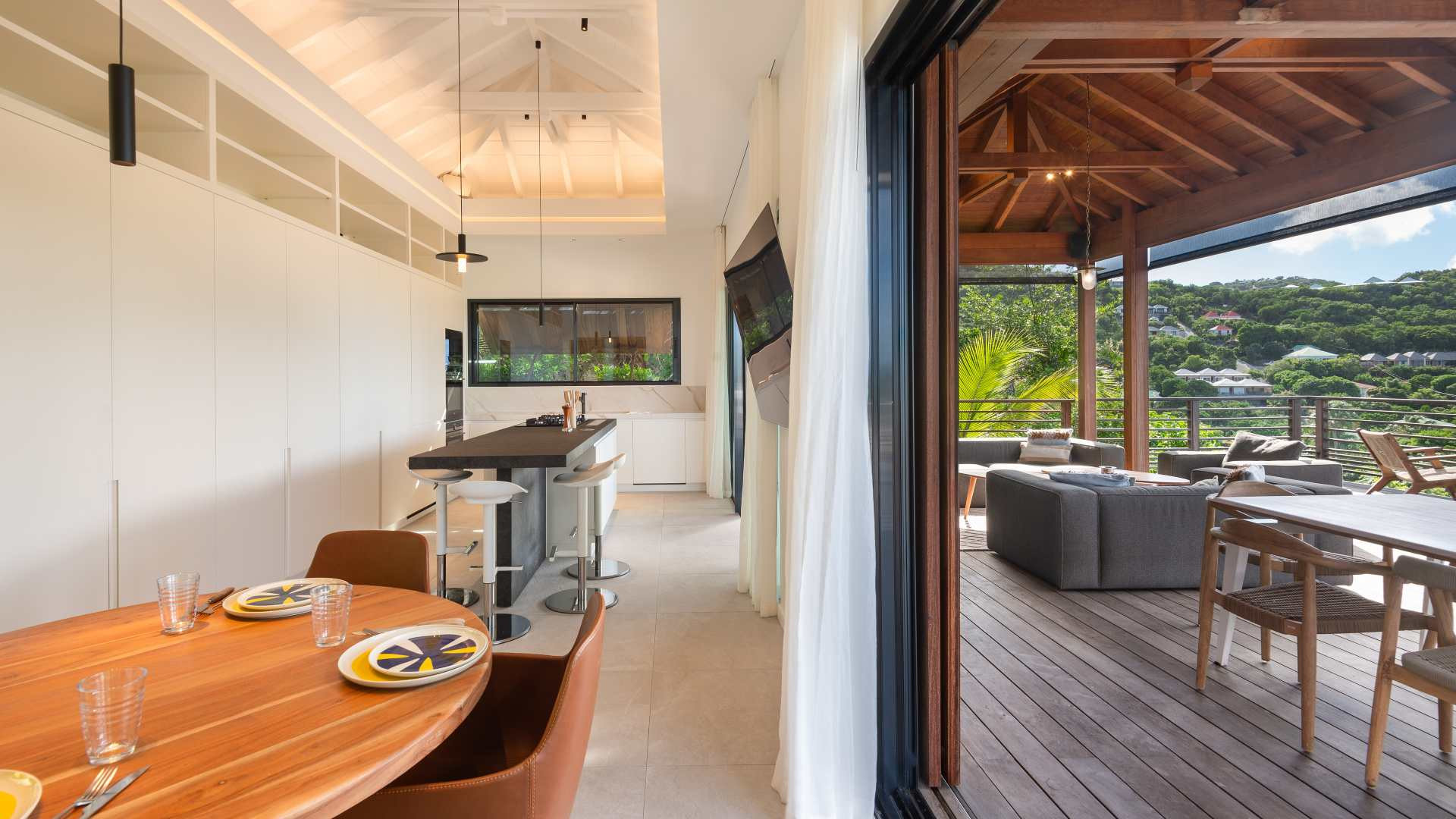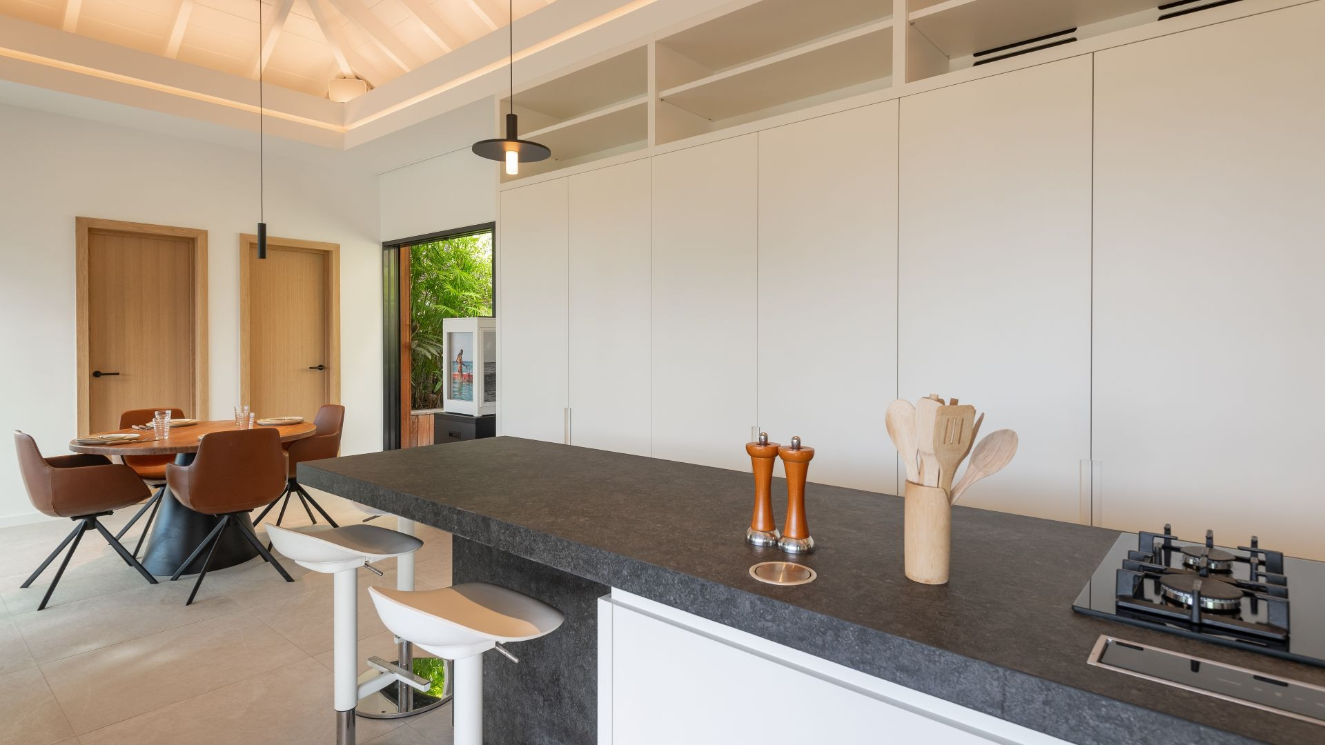 The bright and open living spaces create a seamless flow between indoors and outdoors, allowing guests to fully embrace the paradisiacal setting of St. Barthélemy. The elegant living room, thoughtfully decorated, opens onto a fully equipped modern kitchen, ideal for intimate gatherings and refined dinners. For an even more exclusive experience, the villa includes the services of a private chef and butler, ensuring a tailor-made stay where every detail is curated.