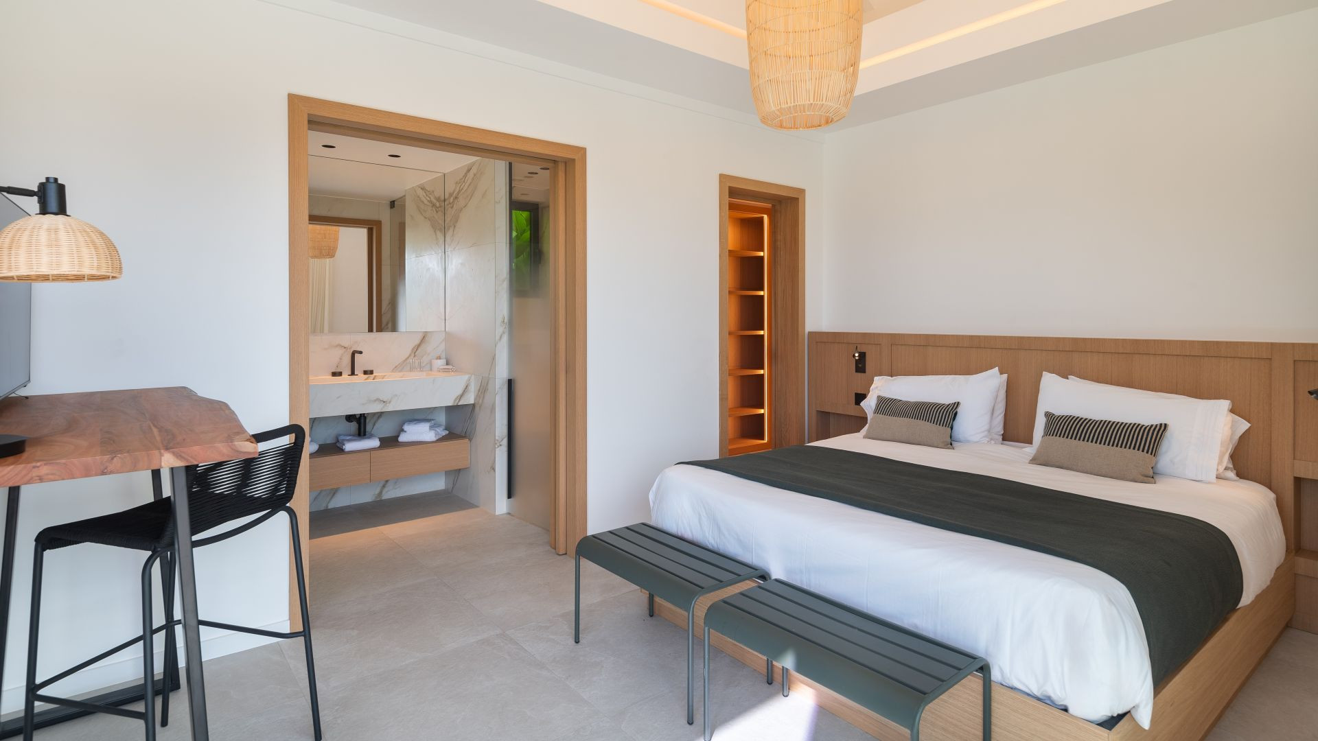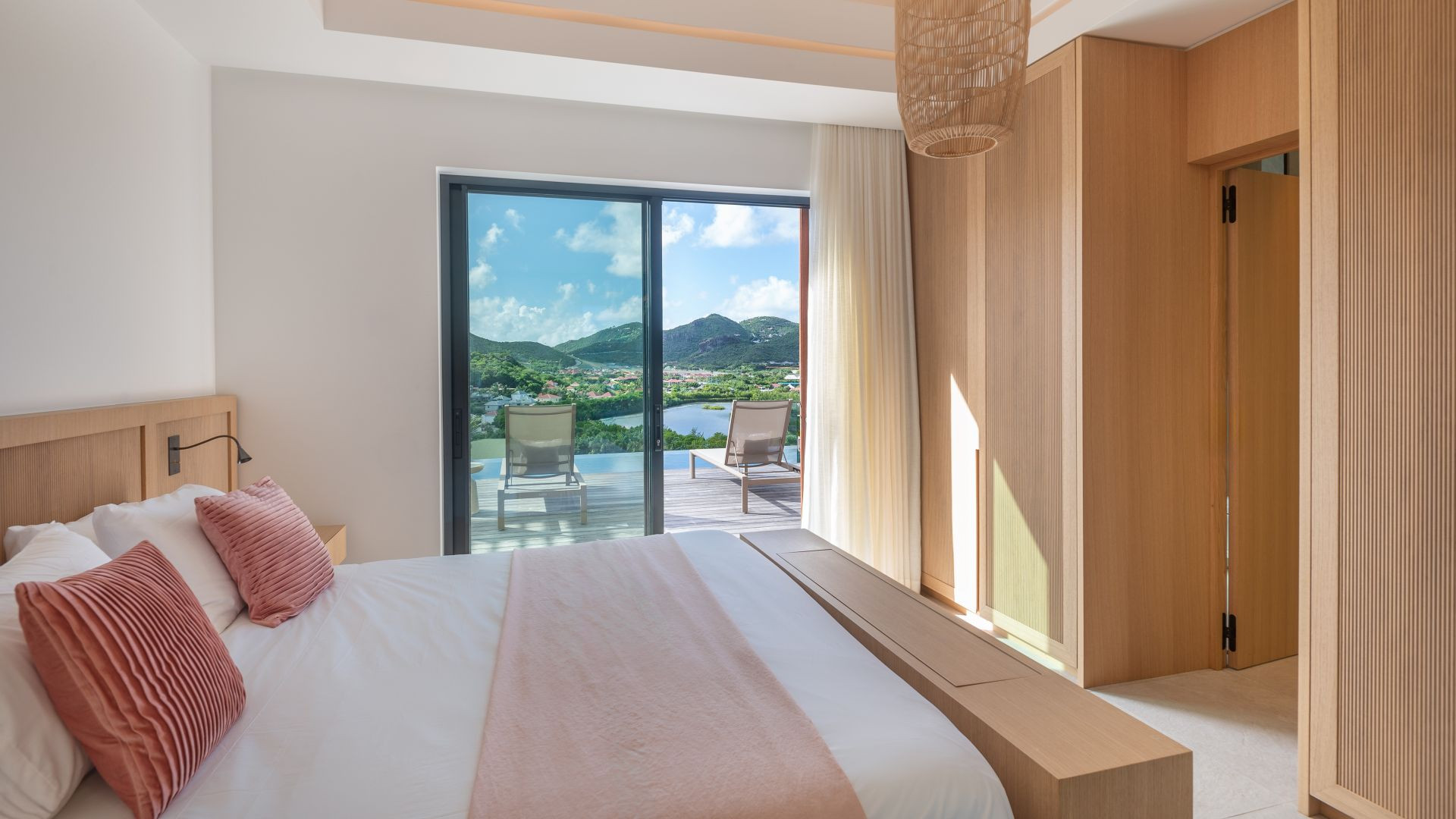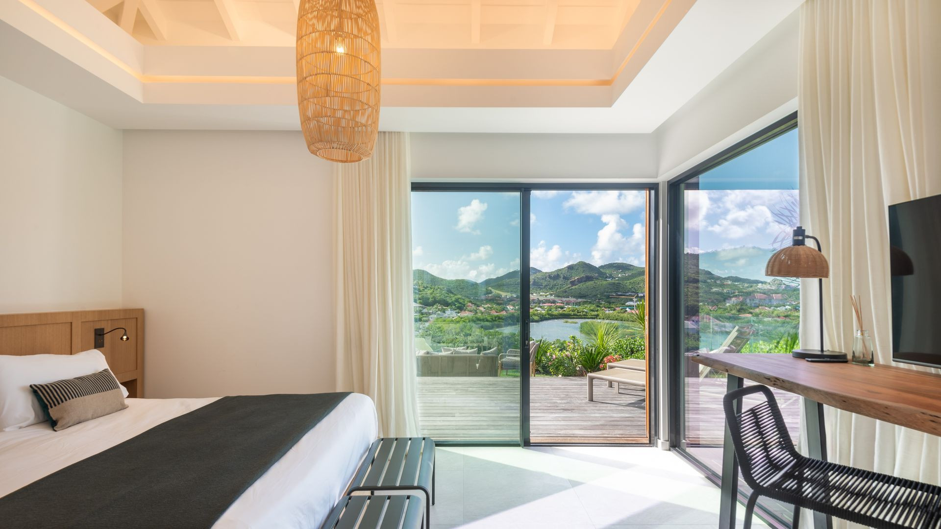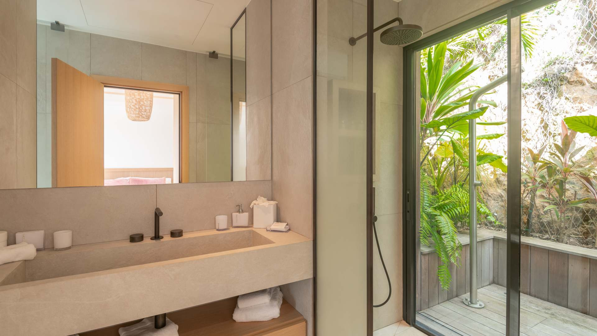 With four en-suite bedrooms, this St. Barts villa rental offers absolute comfort and complete privacy. Each bedroom features a king-size bed, bespoke solid wood furniture, and an ensuite bathroom with glass-walled showers that allow guests to admire the lush tropical landscaping. The warm, sophisticated atmosphere of the sleeping areas ensures peaceful nights, lulled by the gentle trade winds and sounds of surrounding nature.
