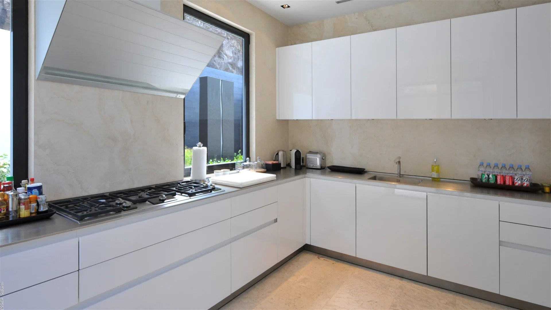 The fully equipped chef’s kitchen ensures effortless meal preparation while allowing private chefs or catering services to work discreetly. A rear courtyard provides an additional space for dining or gatherings, complete with a top-of-the-line barbecue and extra seating.