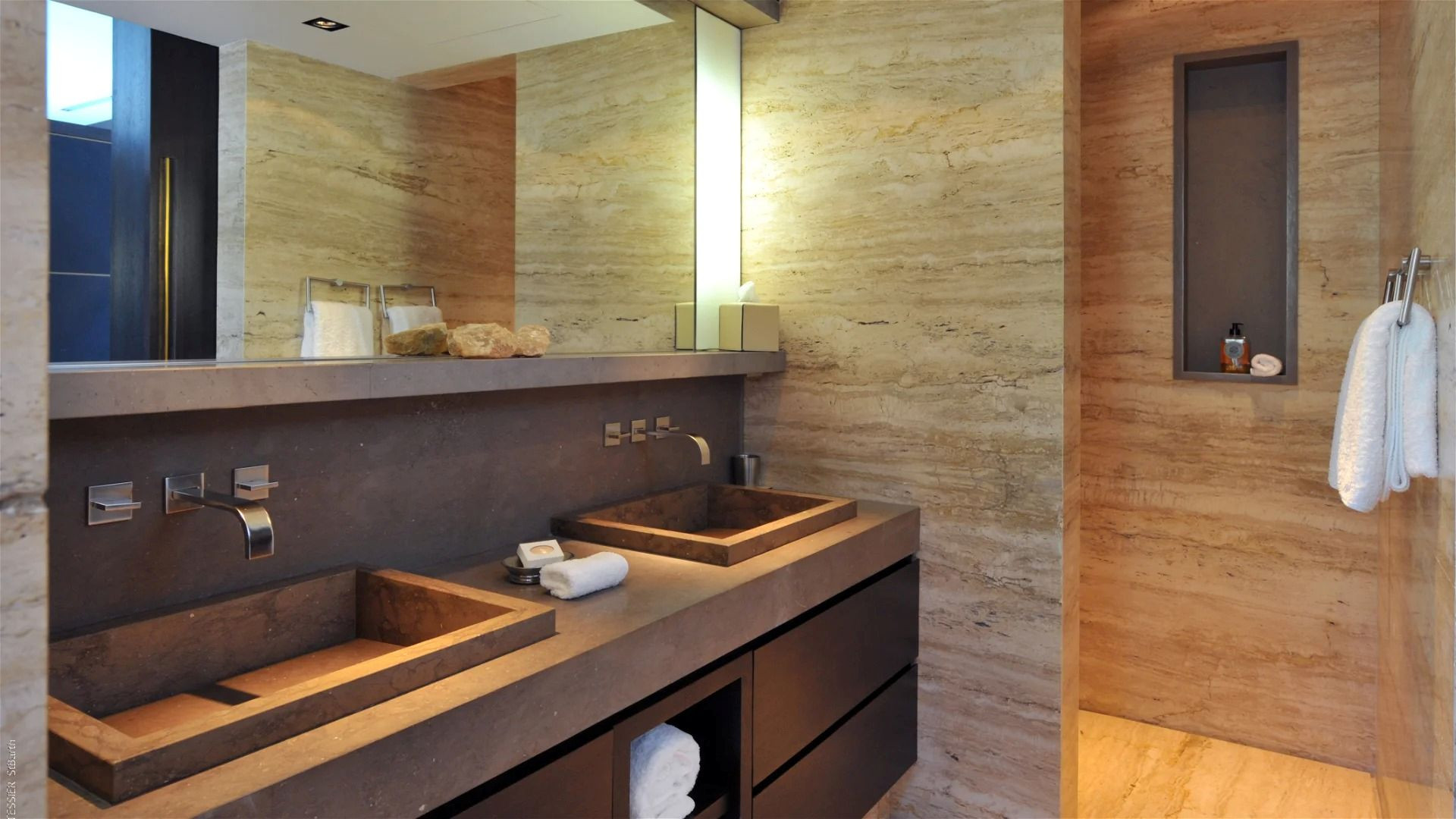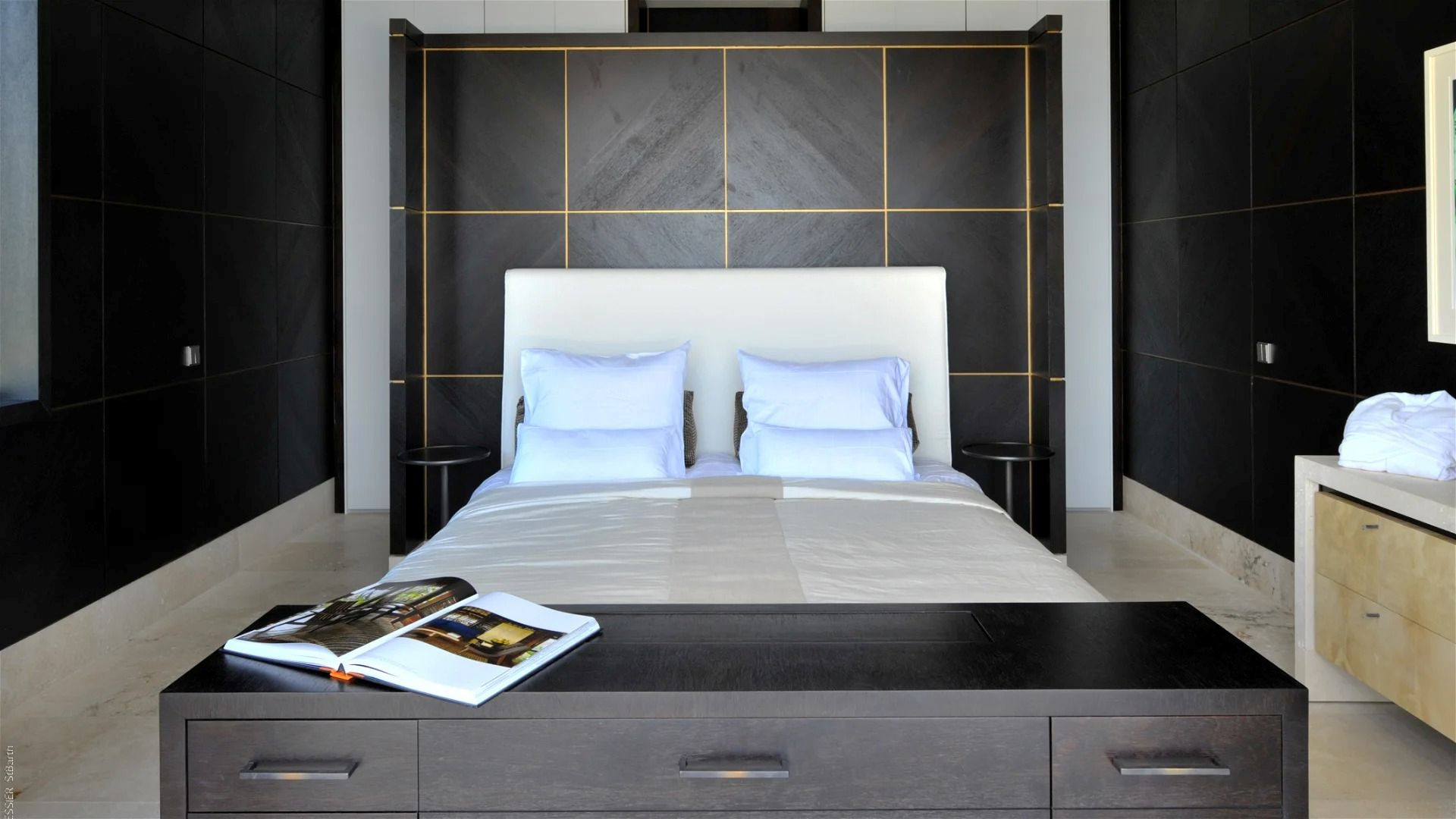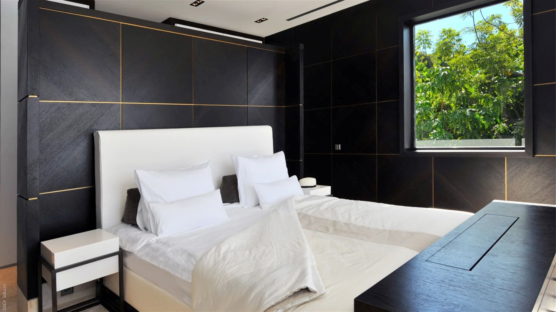 All five bedrooms maintain the same exceptional standard of comfort, making La Petite Sereine ideal for families or groups of friends. Each bedroom offers a luxurious queen bed, ensuite bathroom with double vanity and rain shower, and hidden TV integrated into custom cabinetry. Two bedrooms are located on the upper level, while the remaining three occupy the lower level with direct access to a second terrace and larger pool, ensuring both privacy and serenity.