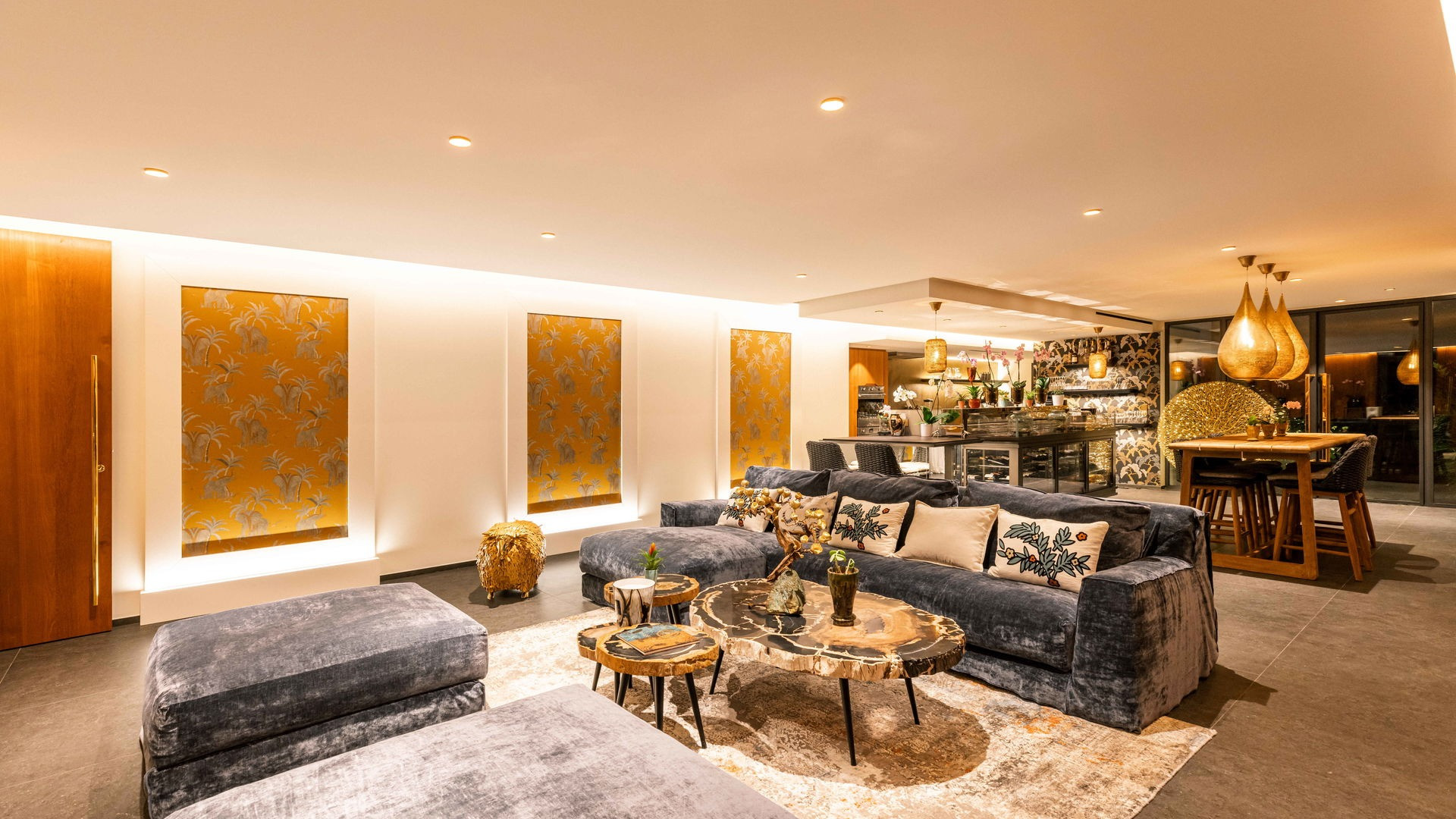 As you step into the villa, you’ll be greeted by a vast open living space that seamlessly extends to the terrace and pool, with a breathtaking panoramic view of the ocean. The interior is bathed in natural light, and the gentle trade winds flow through the space, creating a calm and inviting atmosphere. The elegant and spacious living room, fully integrated with the modern kitchen, offers a refined setting to relax, while the dining area, seating up to six people, is perfect for shared meals with family or friends.