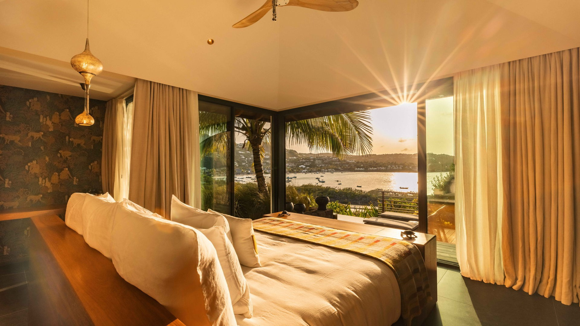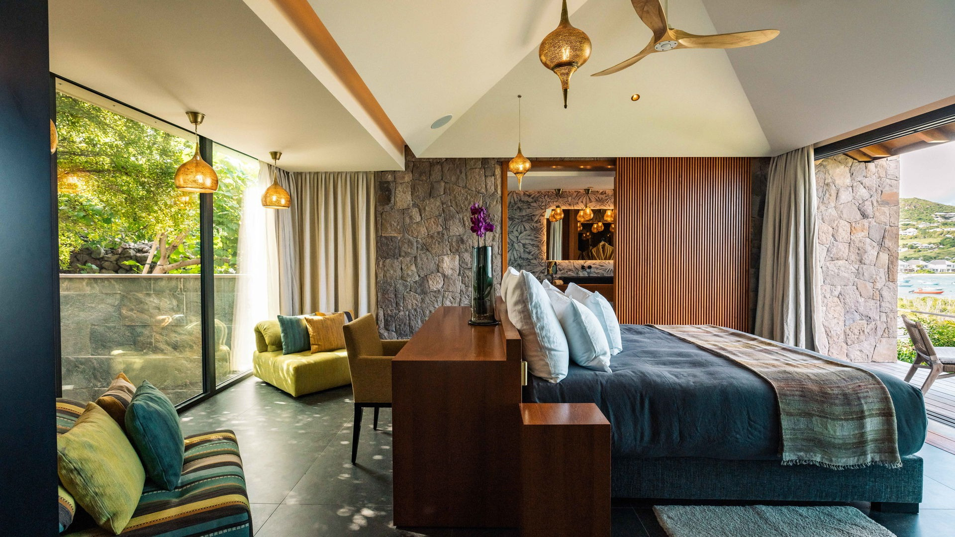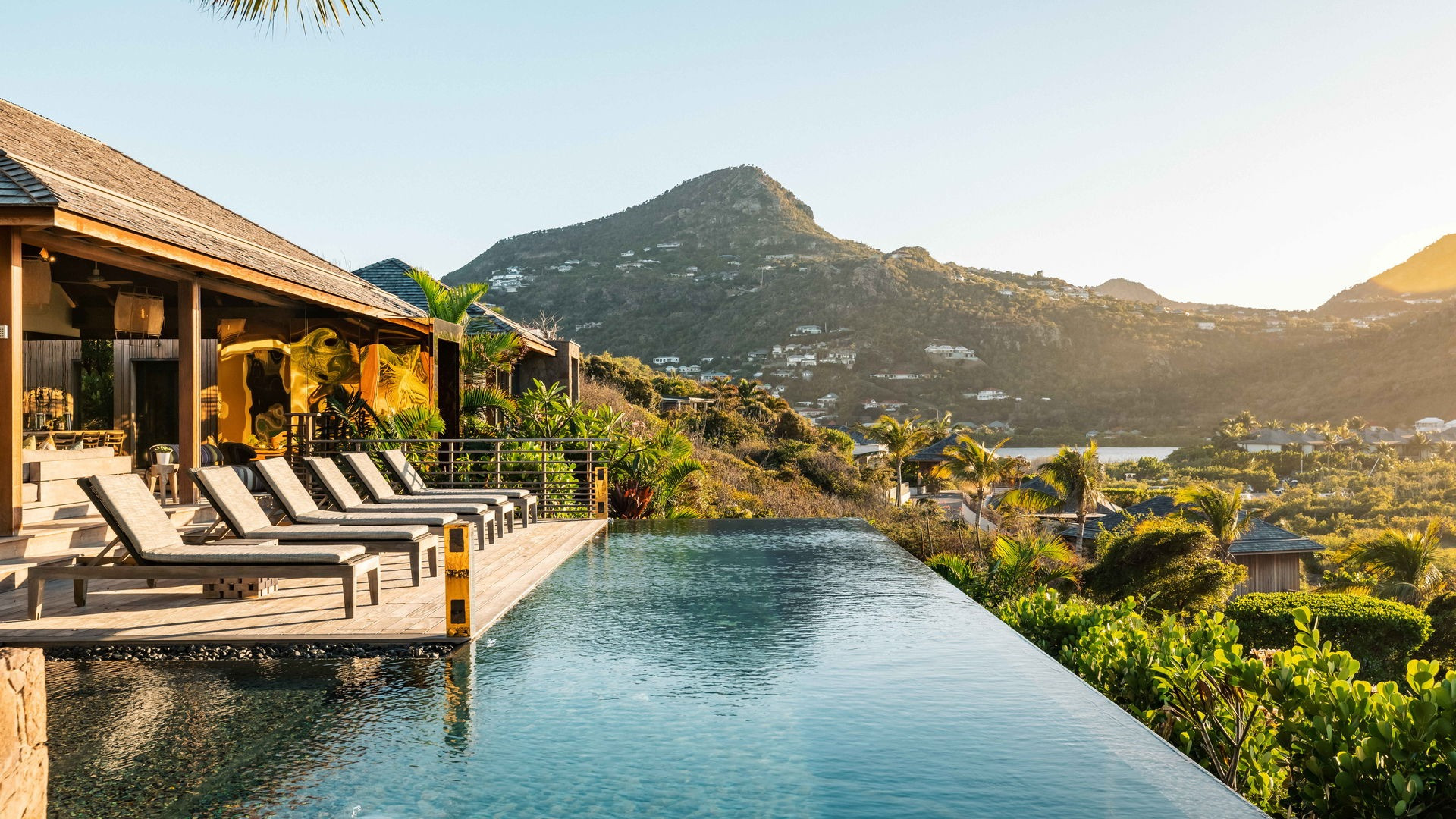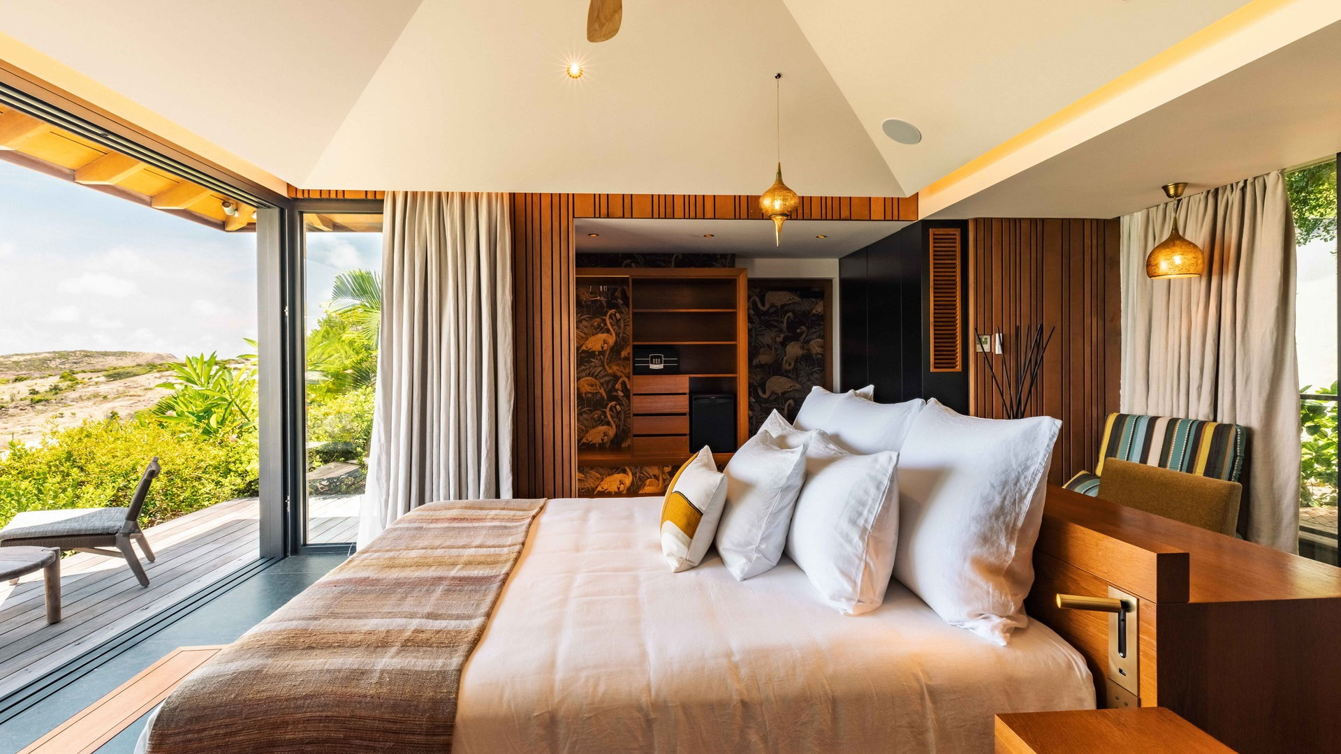 Outside, the private pool stretches out in front of the horizon, offering an exceptional panoramic view of the bay and the Caribbean Sea. This intimate space invites pure relaxation, where the deep blue of the sea and sky merge in an extraordinary setting.