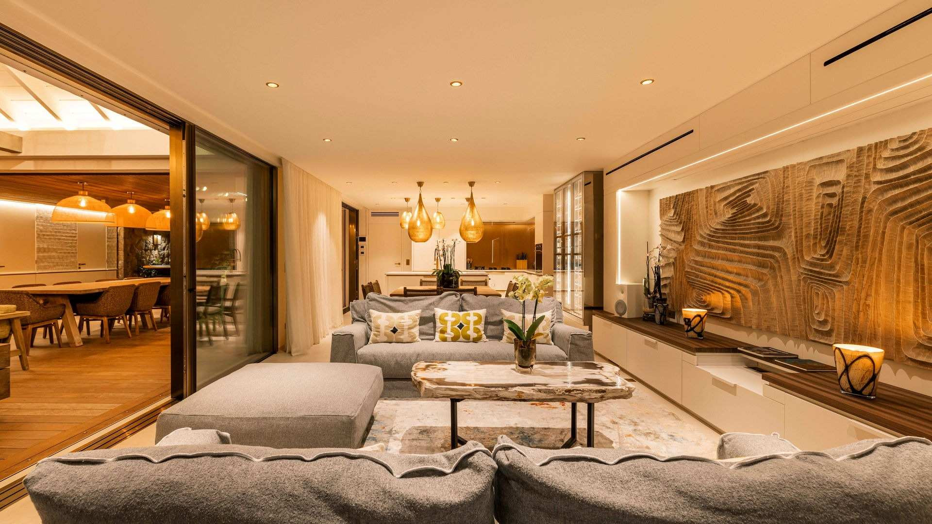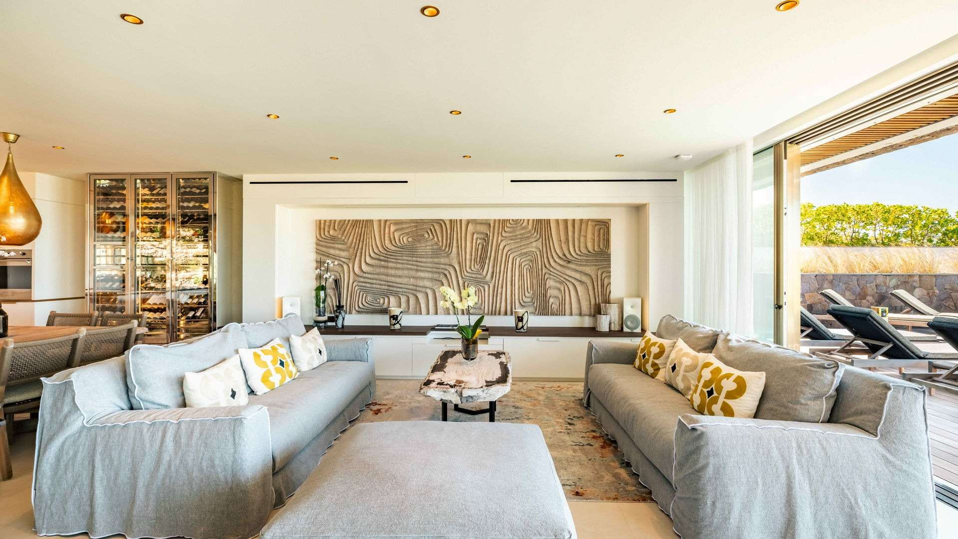 As you step into the villa, you’ll be greeted by a vast open living space that seamlessly extends to the terrace and pool, with a breathtaking panoramic view of the ocean. The interior is bathed in natural light, and the gentle trade winds flow through the space, creating a calm and inviting atmosphere. The elegant and spacious living room, fully integrated with the modern kitchen, offers a refined setting to relax, while the dining area, seating up to six people, is perfect for shared meals with family or friends.