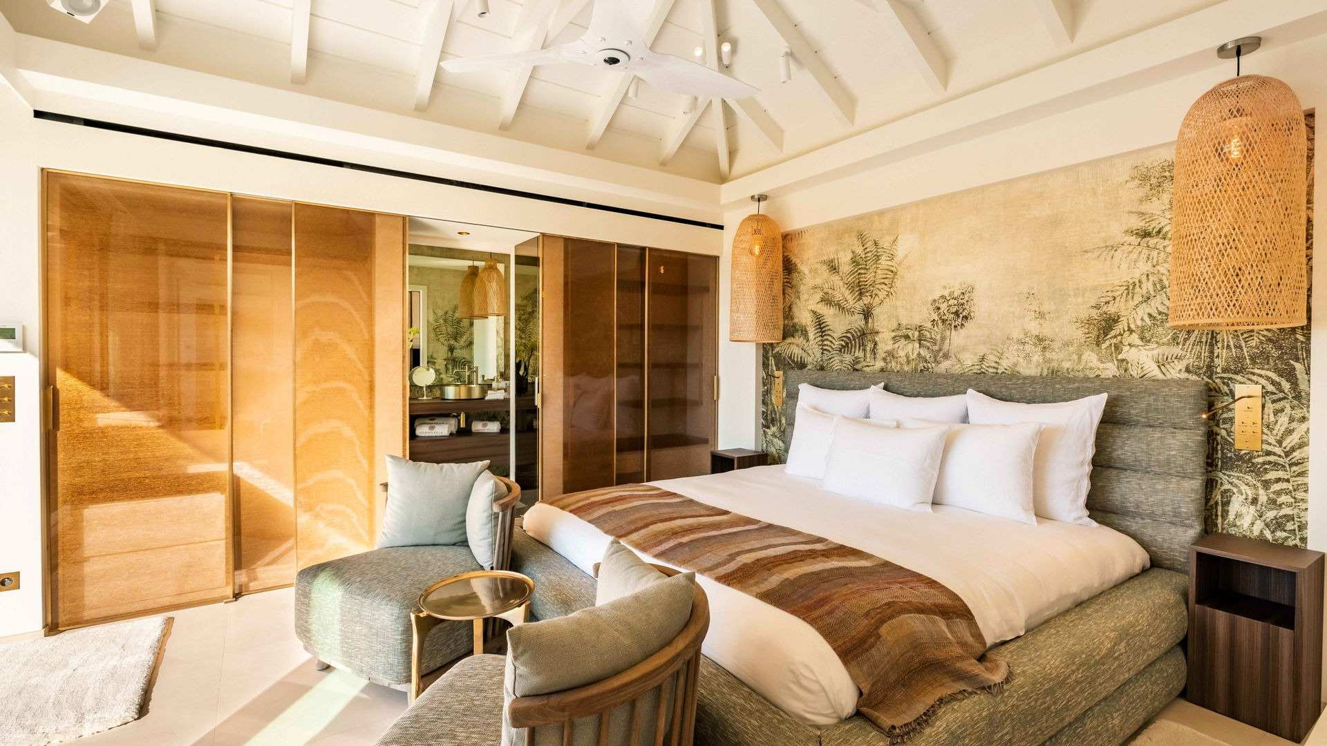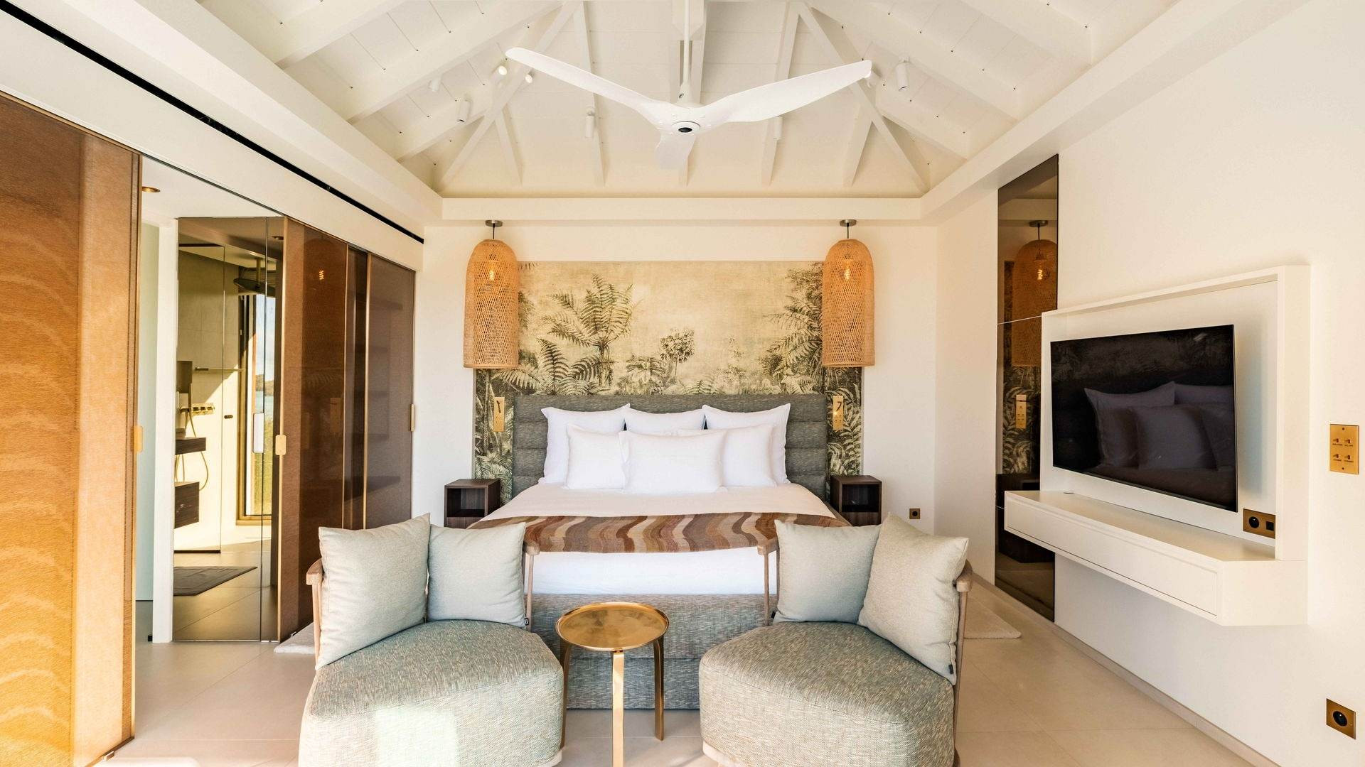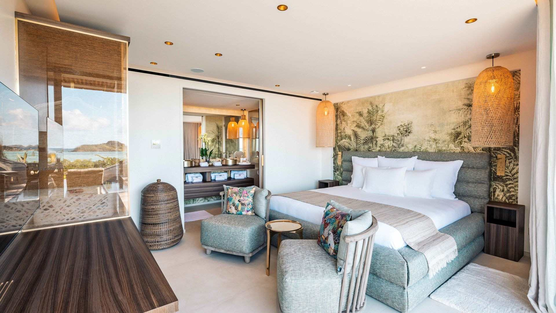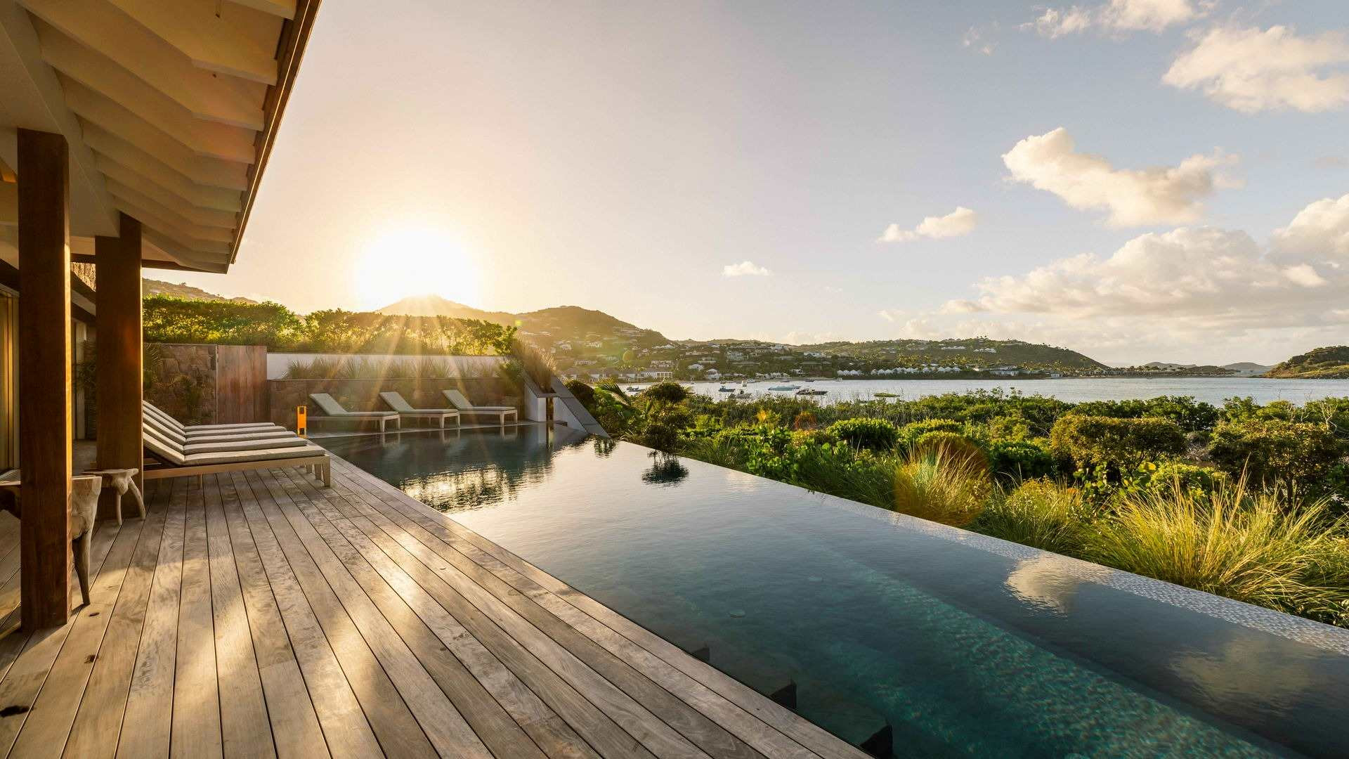 Outside, the private pool stretches out in front of the horizon, offering an exceptional panoramic view of the bay and the Caribbean Sea. This intimate space invites pure relaxation, where the deep blue of the sea and sky merge in an extraordinary setting.